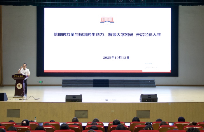 活动伊始,谢金楼面向全体2025级新生以“信仰的力量与规划的生命力:解锁大学密码 开启经彩人生”为题发表演讲。他从认知重启、行动地图与思维升级三个维度出发,为新生指明大学方向、启发成长规划,通过阐释“大学是什么”“如何度过大学四年”“怎样塑造核心竞争力”等关键问题,引导学生树立目标意识,注重长远发展。他强调,大学没有唯一的标准答案,关键在于主动选择的态度与持续行动的努力,鼓励每位同学成为勇于探索的“解码人”。